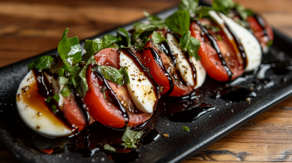 - Drizzle olive oil and balsamic vinegar on top of tomatoes and cheese.