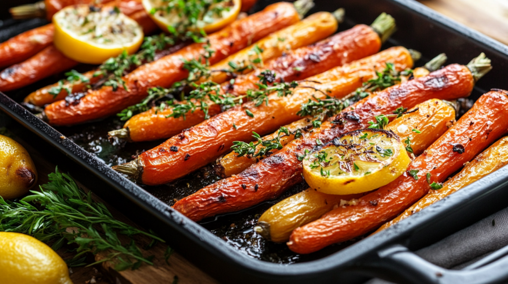 - Roast for 20 minutes. Flip carrots, garlic, and lemon slices and roast for 20 more minutes or until tender.